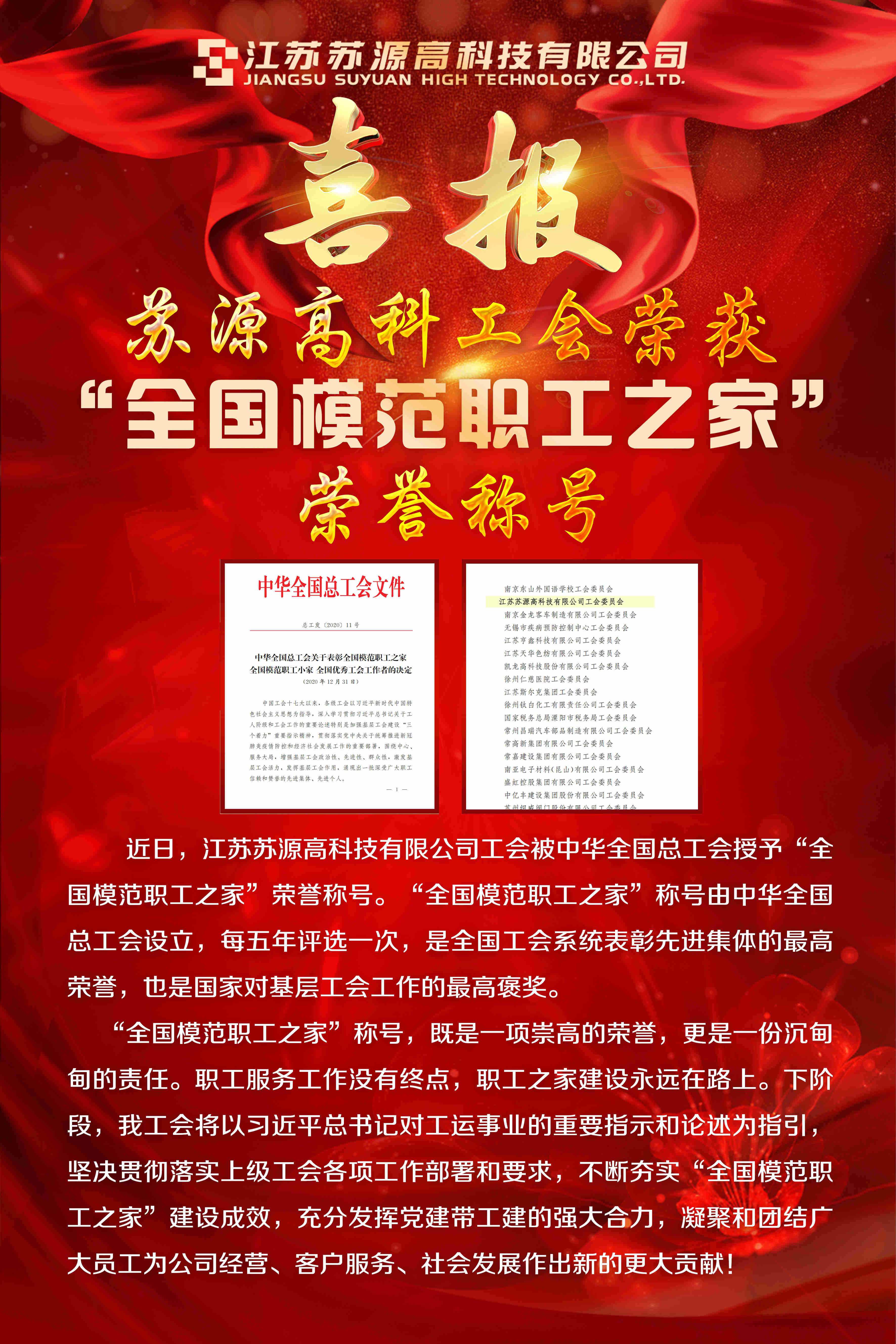 喜報(bào)!蘇源高科工會(huì)榮獲“全國(guó)模范職工之家”榮譽(yù)稱(chēng)號(hào)